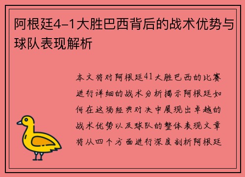 阿根廷与巴西的足球比赛,尤其是两队战成平局的场面,总是引发广泛关注。两支南美强队不仅是足球历史中的劲旅,也在整个足球界占有举足轻重的地位。这场比赛的平局背后,蕴藏着多个层面的因素,这些因素既包括技战术层面的分析,也涉及到心理、体能和球队之间微妙的平衡。本文将从六个关键因素出发,分析阿根廷与巴西平局的...